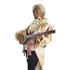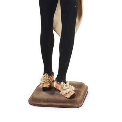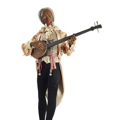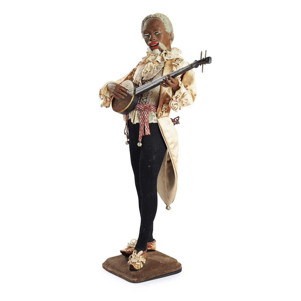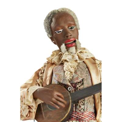the papier mache figure of a minstrel with wool hair, silk coat and waistcoat fitted with bells, with a lace ruff and cuffs, 'playing' a mandolin whilst he rocks and nods his head, blinks his eyes and moves his mouth, with original key