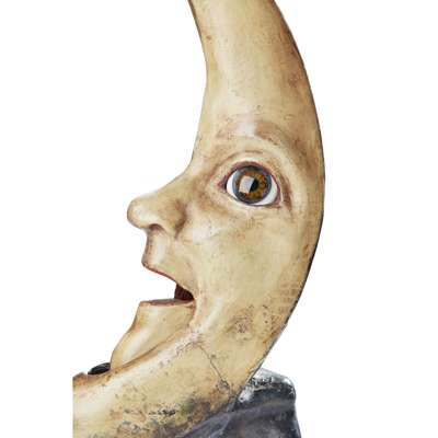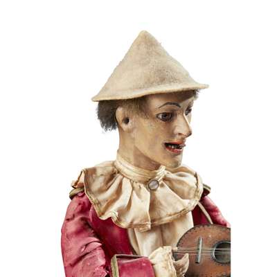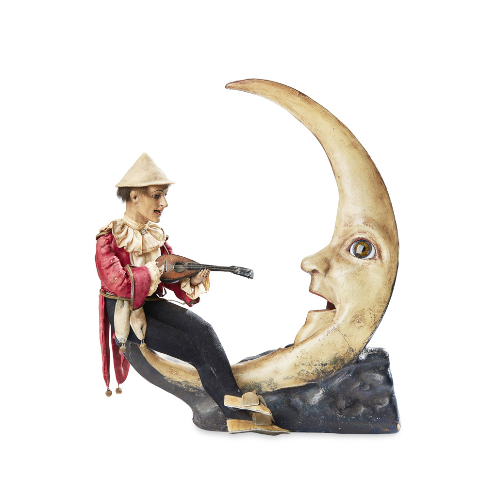 the papier mache figure of Pierrot in felt hat, silk jacket and velvet shoes, seated with a lute, his tongue sticking in and out with a turning and nodding head and articulated arm, whilst the crescent moon moves his mouth and single eye