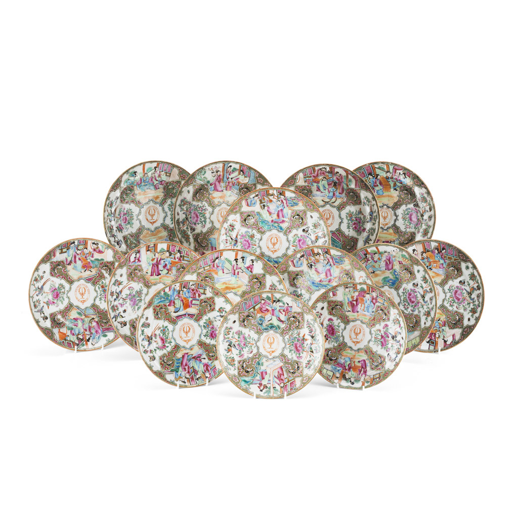 SET OF FOURTEEN CHINESE ROSE MANDARIN ARMORIAL DISHES