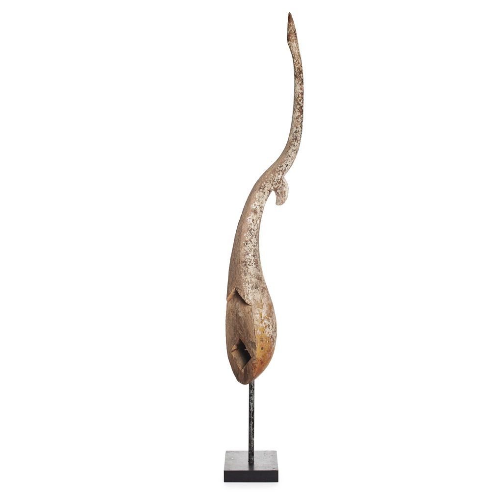 of curved form, with traces of gilt decoration, mounted on a black painted stand
