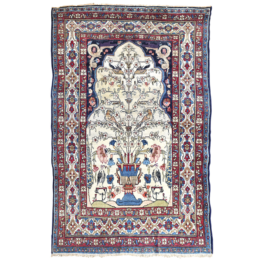 the cream mihrab with bird filled tree of life pattern, indigo spandrels, within cream rosette cartouche border