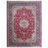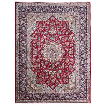 the red field with cream and olive medallion, similar spandrels, within indigo palmette and foliate vine border