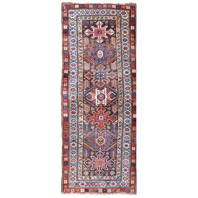 the brown field with multiple polychrome geometric medallions, within cream rosette and vine border