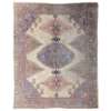 the cream field with slate blue medallion flanked by pink medallions, blue spandrels, within blue rosette and serrated leafy vine border