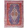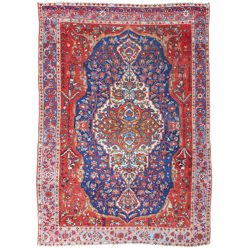 the indigo field with cream and orange medallion, long red spandrels, within blue rosette and vine border