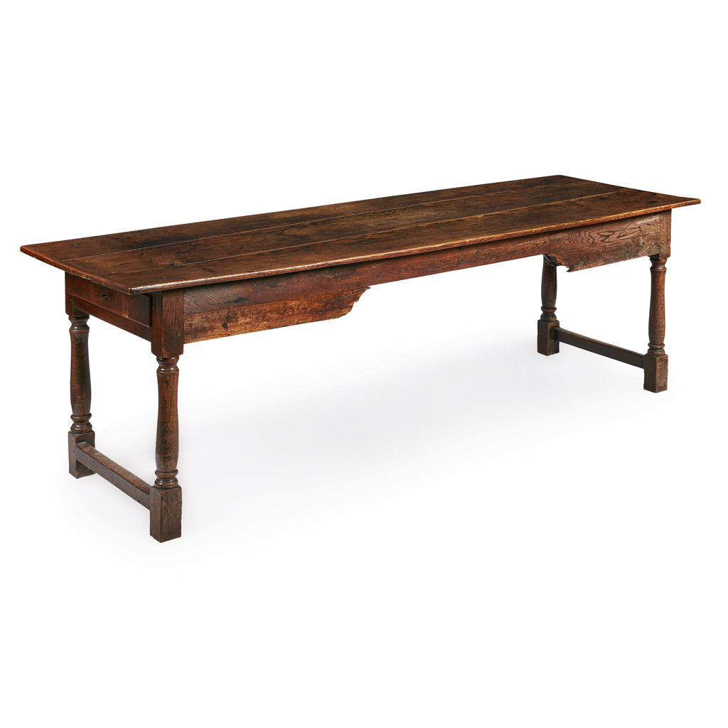 the rectangular plank top above a plain frieze, with drawers to both ends, raised on turned and block legs, the ends united by stretchers