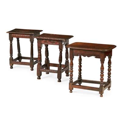 two in the 17th century style with plank seats and chip carved details, 46cm wide, 56cm high, 31cm deep, and 46cm wide, 58cm high, 30cm deep; and one in early Georgian style, with a moulded plank seat and shaped seat rail, 54cm wide, 56cm high, 37cm deep; all with all paper labels underneath 'Mrs Hetherington / Dunfraoich' (3)