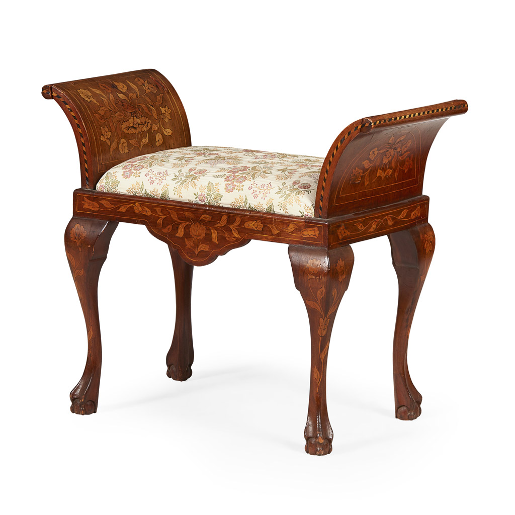 DUTCH WALNUT AND MARQUETRY PIANO BENCH