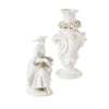 the first a figure of Columbine, sitting with a hurdy gurdy, 12cm high; the second a candlestick with a band of flowers above C scrolls and cartouches, 15cm high (2)