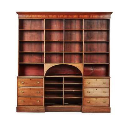the cavetto moulded cornice over open shelves and a central arched recess; the lower part of inverted breakfront outline with a central shelved recess flanked by two banks of three drawers, on a plinth base