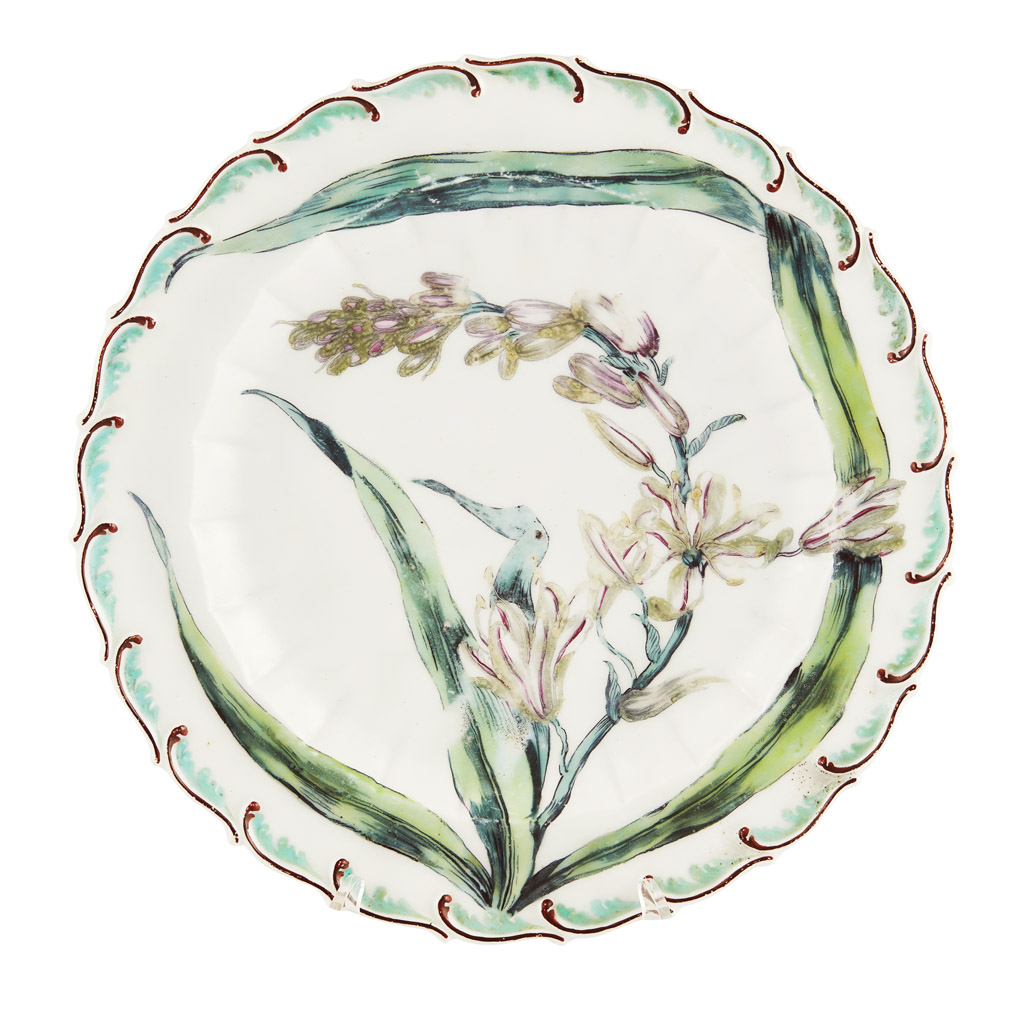 the moulded border enclosing blossoming flowers amongst leaves, with red anchor mark and old trade label ROGER JELLICOE, LONDON W8