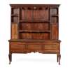 the moulded cornice with an egg and dart moulded and scrolling frieze centred by a shell motif, over two open shelves flanked by cupboard doors; the base with three drawers above a shaped shell carved apron and two shallow drawers, on shell carved cabriole legs terminating in pad feet