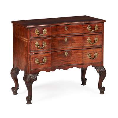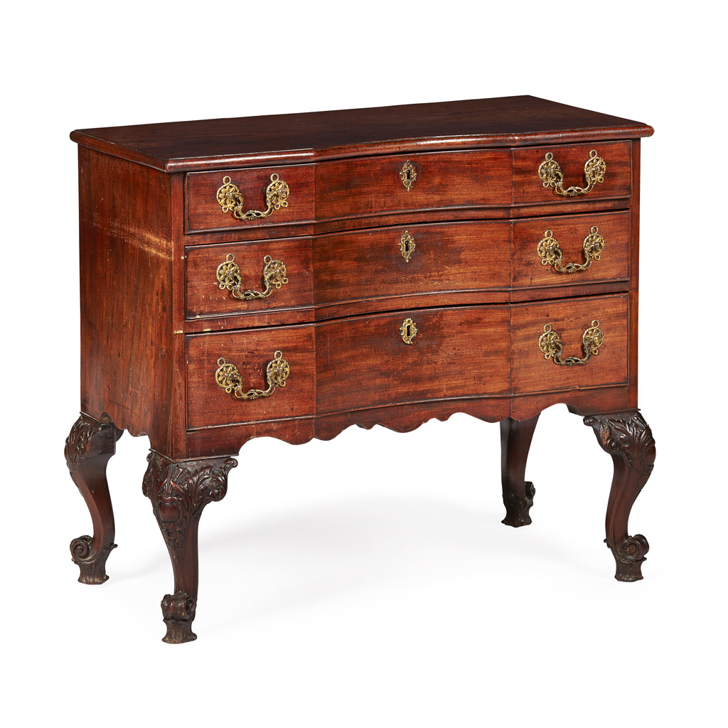 the moulded semi concave top above three conforming graduated drawers, over a shaped apron and raised on leaf carved cabriole legs ending in raised scroll feet