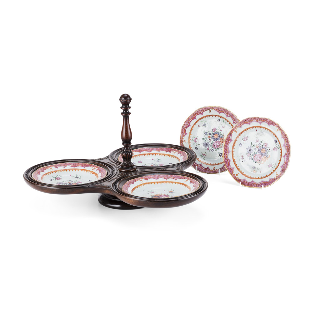 the central turned column over a triform lobed base fitted with three Chinese Export famille rose dishes, bearing an ivorine label 'Muirhead Moffat & Co./ Antiques/ Glasgow'; with two further matching side plates (6)