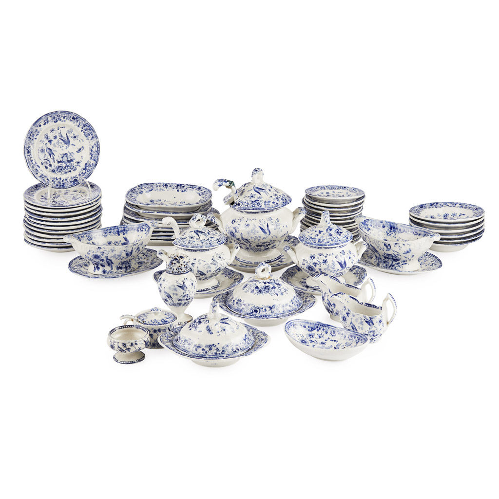 blue transfer printed with birds amongst fruit and flowers, comprising twelve dinner plates; six soup dishes; twelve side plates; two vegetable tureens and cover;, three soup tureens, covers and stands with two ladles; two sauce tureens and stands; two vegetable dishes; two gravy boats; a salt/pepper pot; a mustard pot, cover and spoon; a small tureen; an oval serving dish; and six rectangular platters, various impressed marks (qty)
