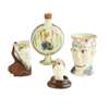 comprising a Prattware stirrup cup with the face of a satyr, in a later stand, 11cm high; a circular Whieldon type flask moulded with the busts of George III and Queen Charlotte, 19.5cm high; a Whieldon type bonbonniere in the form of a lady's head, on a later mahogany stand, 7.5cm high; and a Staffordshire figural tankard with the head of a bearded gentleman, his hair forming the handle, 14cm high (4)