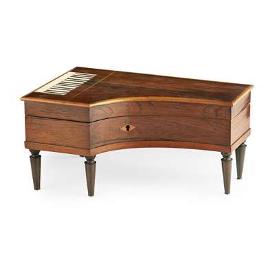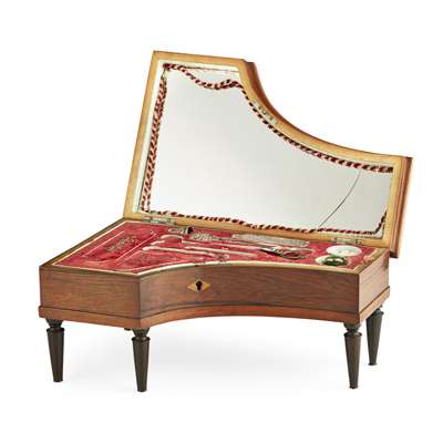 in the form of a piano, opening to a mirror above a fitted interior with a lift-out tray and accessories, with a cylinder movement