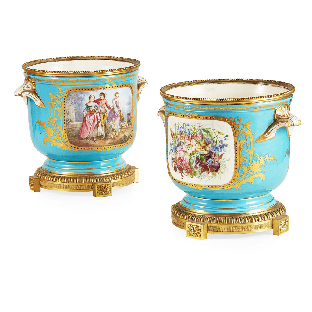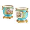 with twin handles, painted with figural and flower reserves on a bleu celeste ground, mounted with gilt bronze fluted bases and rectangular feet cast with flower prunts, with blue crossed L marks (2)