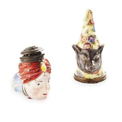 modelled as the head of a lady wearing a red turban, blue crossed swords mark, 5.5cm long; together with a CONTINENTAL PORCELAIN BONBONNIERE in the form a boar's head wearing a peaked yellow hood decorated with flowers, blue crossed marks, 8.5cm high; (2)