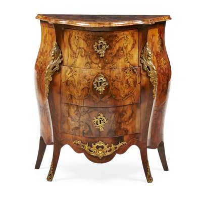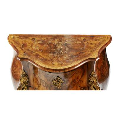 ITALIAN WALNUT AND MARQUETRY BOMBE COMMODE