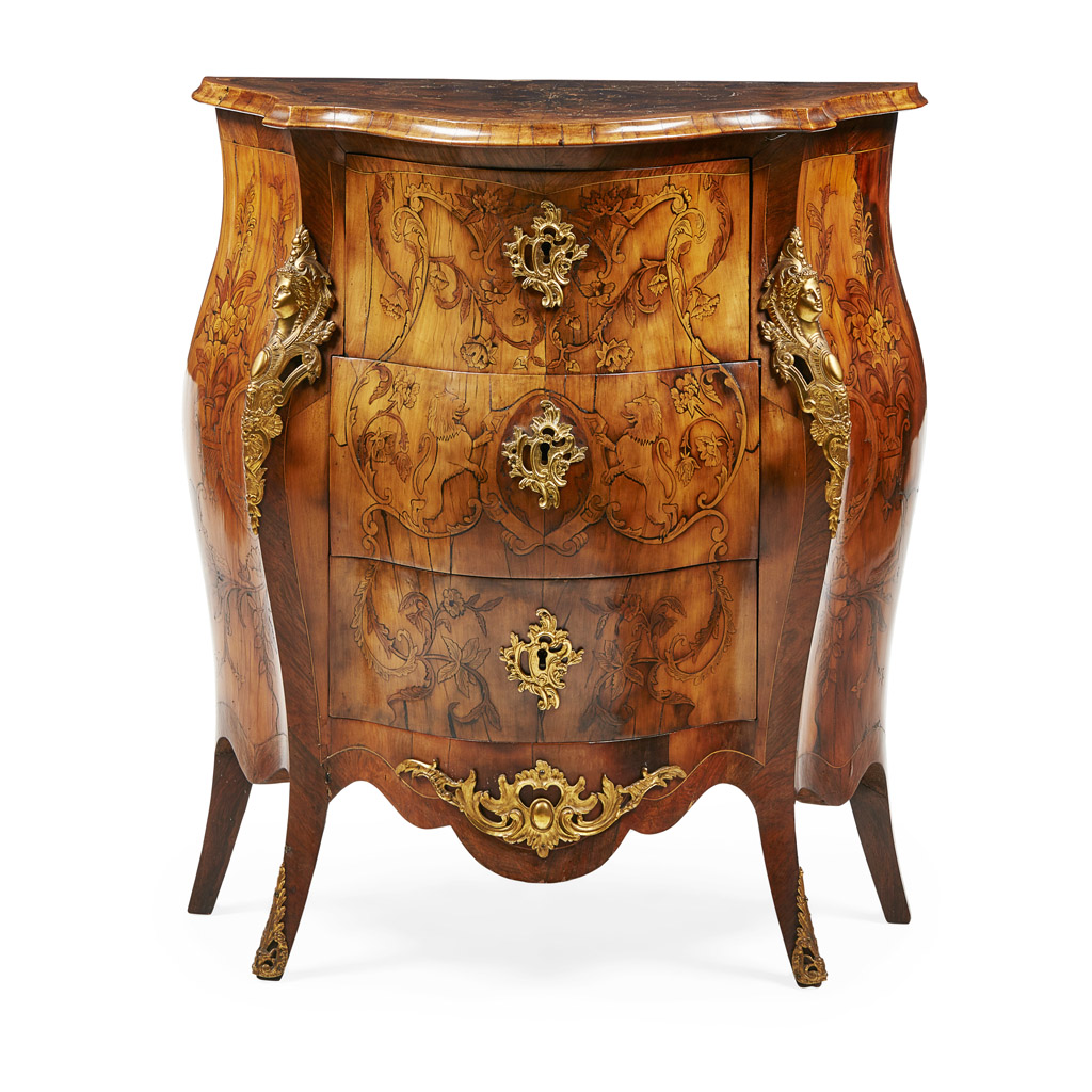 the serpentine top with a moulded edge and inlaid with foliate scrolls and flowers, over three bombe drawers inlaid with a heraldic cartouche and foliate scrolls, gilt metal mounts, raised on splayed legs