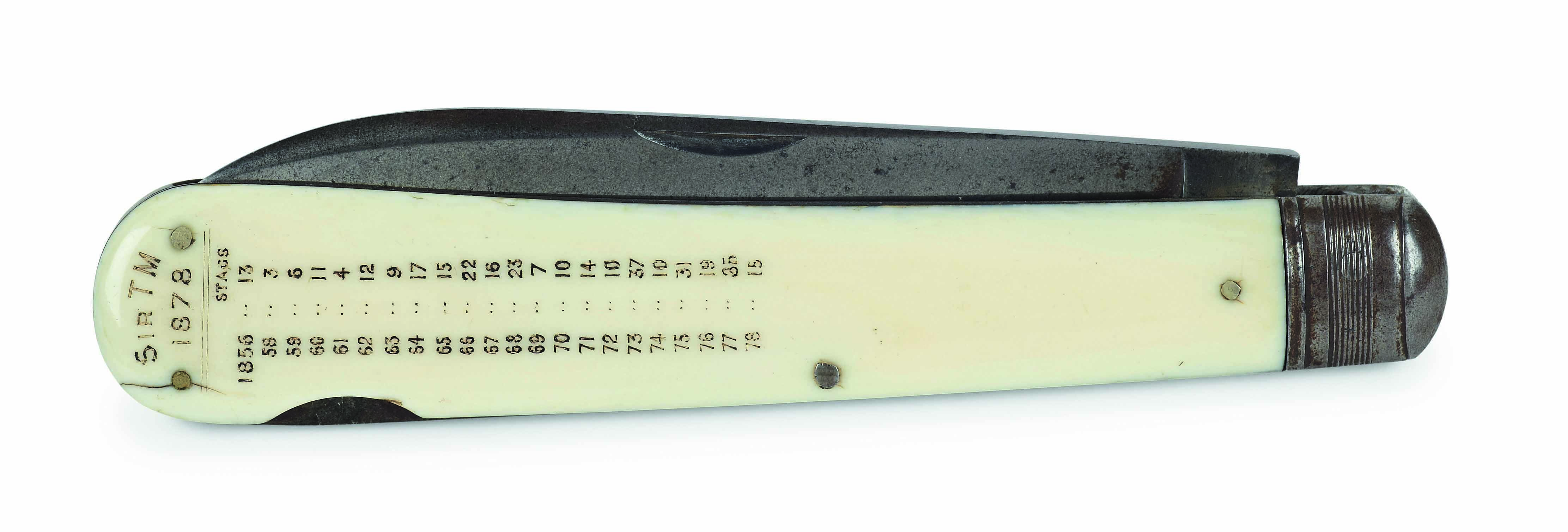 the ivory grip inscribed to one side 'Su TM 1878' and with twenty two years stags, blade marked F West London, 2014