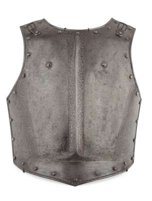 in the 16th century style, of peascod form, with raised central rib, decorated with three long panels of etched foliate scrolls, two neck buckles and raised rivet heads throughout