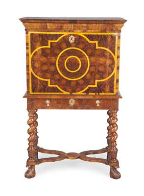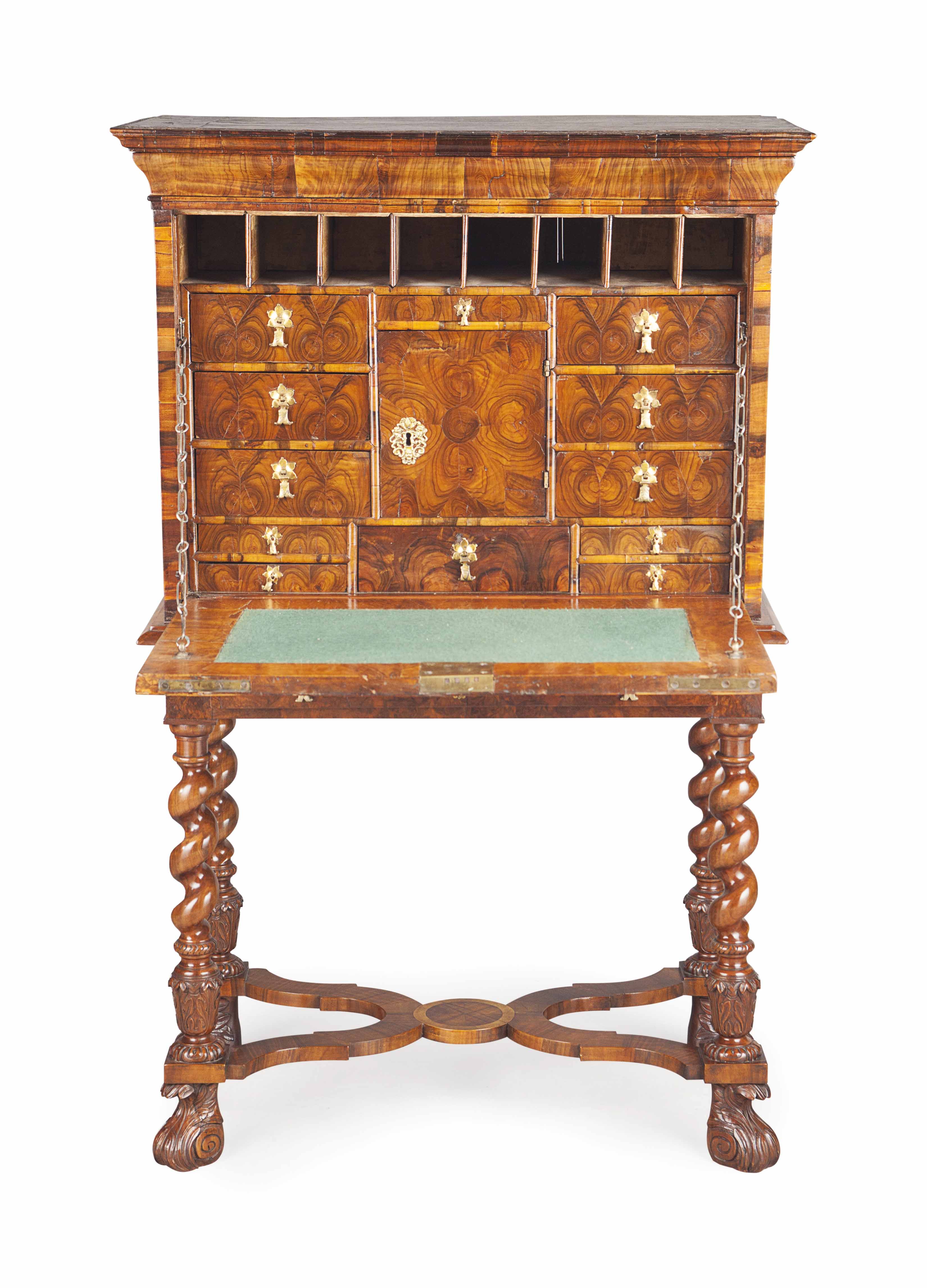 WILLIAM AND MARY WALNUT, FRUITWOOD AND OYSTER VENEERED ESCRITOIRE