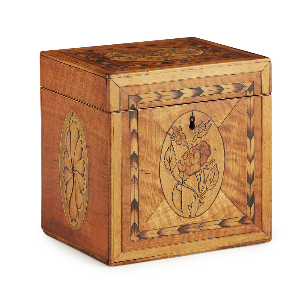 GEORGE III SATINWOOD, FEATHER BANDED AND INLAID TEA CADDY