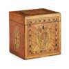 of cubic form, the hinged cover opening to a void interior, the sides inlaid with oval floral and shell medallions