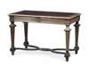 the tooled and gilt red leather insert in a rectangular top with a moulded edge, above a long frieze drawer and raised on square tapered legs joined by a shaped X form stretcher and ending on tapered foliate feet
