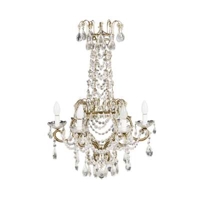 the corona hung with facetted glass drops above a swagged riviere column and six scrolled branches, further hung with drops and set with cut glass drip trays, fitted for electricity