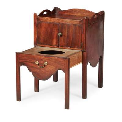 the square galleried top with cut-out handles above twin doors enclosing an associated ceramic chamber pot, raised above a pull-out commode and divided front legs with moulded angles