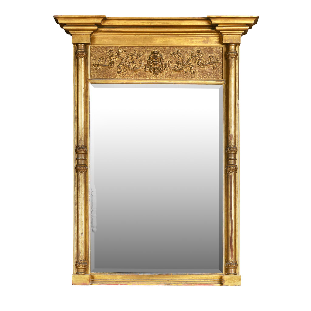 the projecting reverse breakfront cornice above a frieze panel with applied leaf decoration and with bevelled mirror plate, enclosed by leaf-clasped pilasters