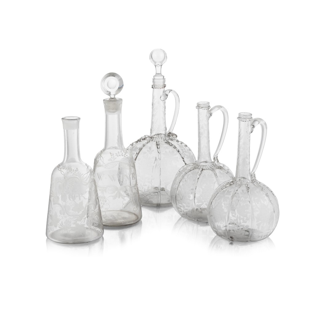 comprising three Continental examples with a narrow neck and globular body and applied glass bands, etched with fruiting vines, 33cm and 24cm high; and two English mallet form decanters etched with fruiting vines, one marked 'PORT', the other 'W. WINE', 30cm and 23.5cm high (5)