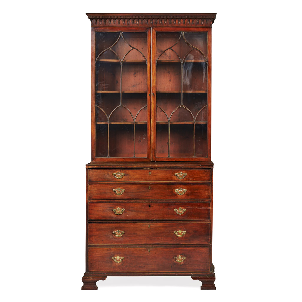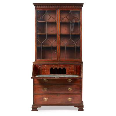 the straight cornice with key and gothic arch moulding above a pair of astragal glazed doors opening to shelves; the lower part with a secretaire drawer with a false double drawer front, over three graduated long drawers, raised on ogee bracket feet