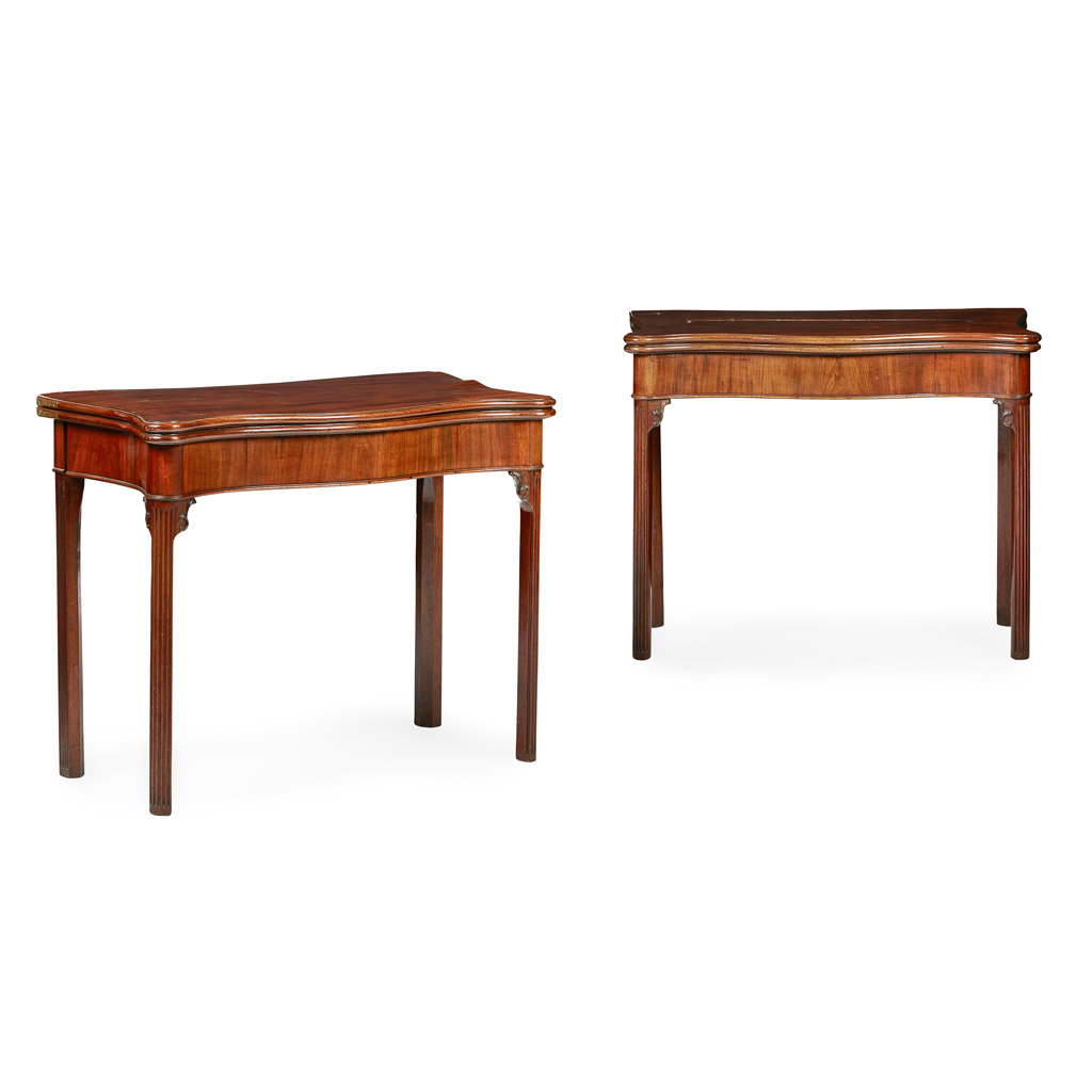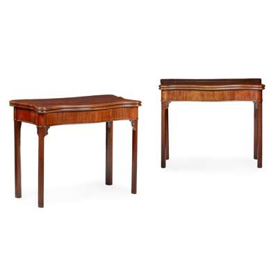 PAIR OF GEORGE III MAHOGANY SERPENTINE FOLDOVER GAMES TABLES