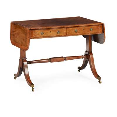 REGENCY STYLE MAHOGANY AND BURR WOOD SOFA TABLE