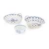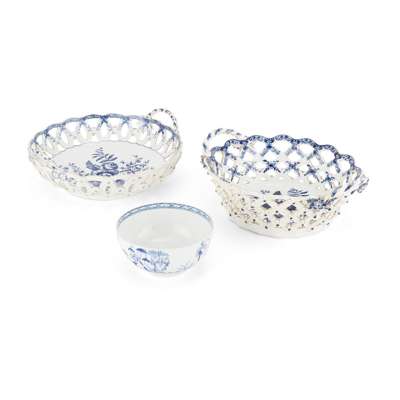 the first example circular with twin handles, decorated with flower prunts, underglaze blue crescent mark, 23cm wide; the second example oval with twin handles, decorated with flower prunts, 24cm wide; together with a WORCESTER BLUE AND WHITE 'BIRD IN A RING' PATTERN BOWL, with an underglaze blue crescent mark, 12cm diameter (3)