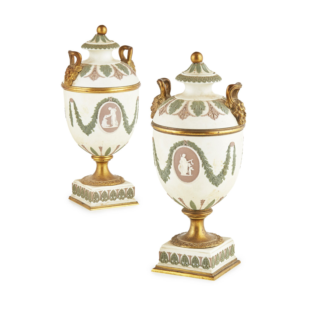 PAIR OF WEDGWOOD TRICOLOUR GILT BRONZE MOUNTED URNS
