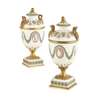 the domed covers above twin-handled bodies decorated with cameos, foliage and swags, in green and pink on a white ground, raised on a gilt metal foot and square base, impressed WEDGWOOD, one with a further indistinct mark (2)