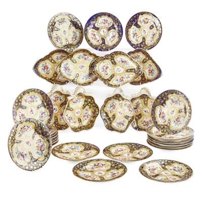 with reserves of flowers within cream and gilt borders on a dark blue ground with gilt vines, comprising four shell-form dishes; four oval shaped dishes; and twenty-two side plates (30)