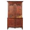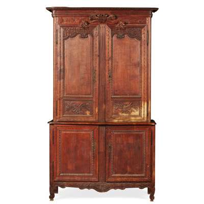 the moulded cornice above a frieze carved with flower garlands and a pair of hearts over pair of doors carved with flower bouquets and musical trophies, opening to shelves; the lower part with a pair of carved panel doors, raised on foliate carved cabriole legs