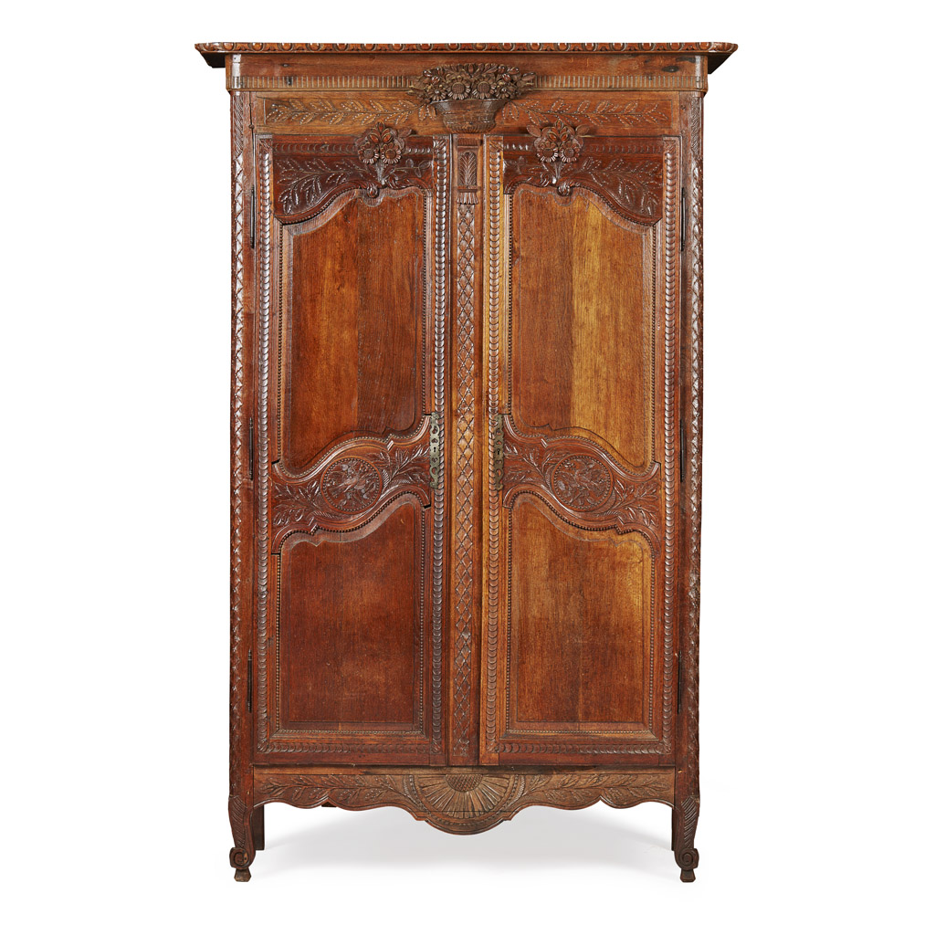 the moulded cornice above a frieze carved with laurel leaves and centred by a flower filled basket, above a pair of panel doors carved with further laurel branches and flower bouquets, raised on cabriole legs ending in scroll feet