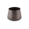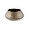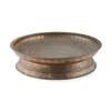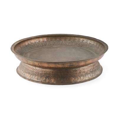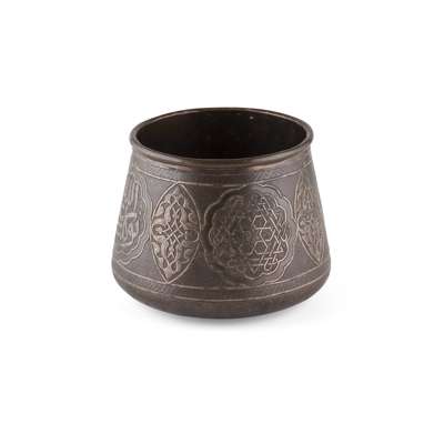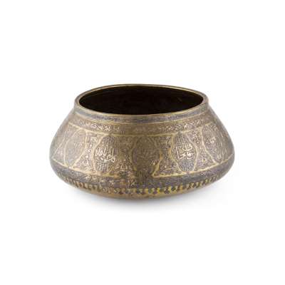 comprising a brass and lacquered bowl, of rounded form, engraved with reserves and script, 29.5cm wide; a copper footed bowl, engraved with script, 44cm diameter; and a copper bowl of tapered form, engraved and inlaid with white metal with reserves depicting symbols and script, 22.5cm high (3)
