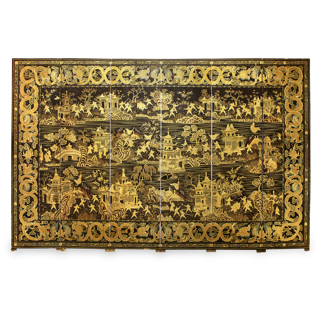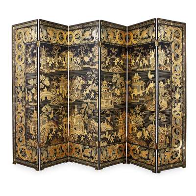 CHINESE EXPORT BLACK AND GILT LACQUER SIX PANEL SCREEN