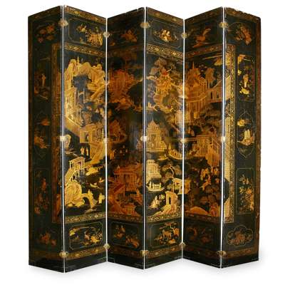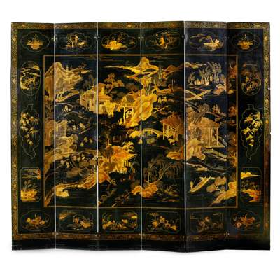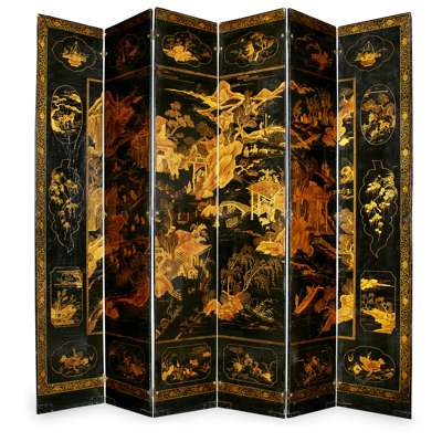 CHINESE EXPORT BLACK AND GILT LACQUER SIX PANEL SCREEN