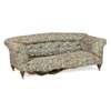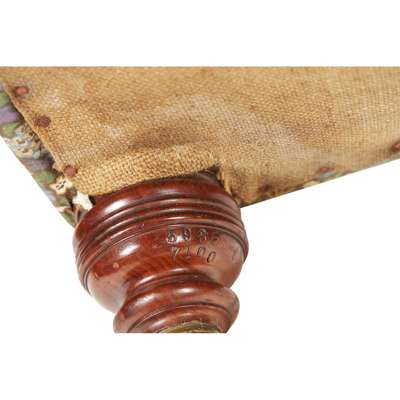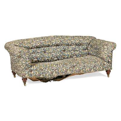 the low slightly arched button tufted back above a deep seat and scrolled arms, raised on turned mahogany legs ending in brass castors, the castors and rear leg stamped 'HOWARD & SONS/ LONDON' with model no. 5985/7100, in distressed floral print cotton upholstery