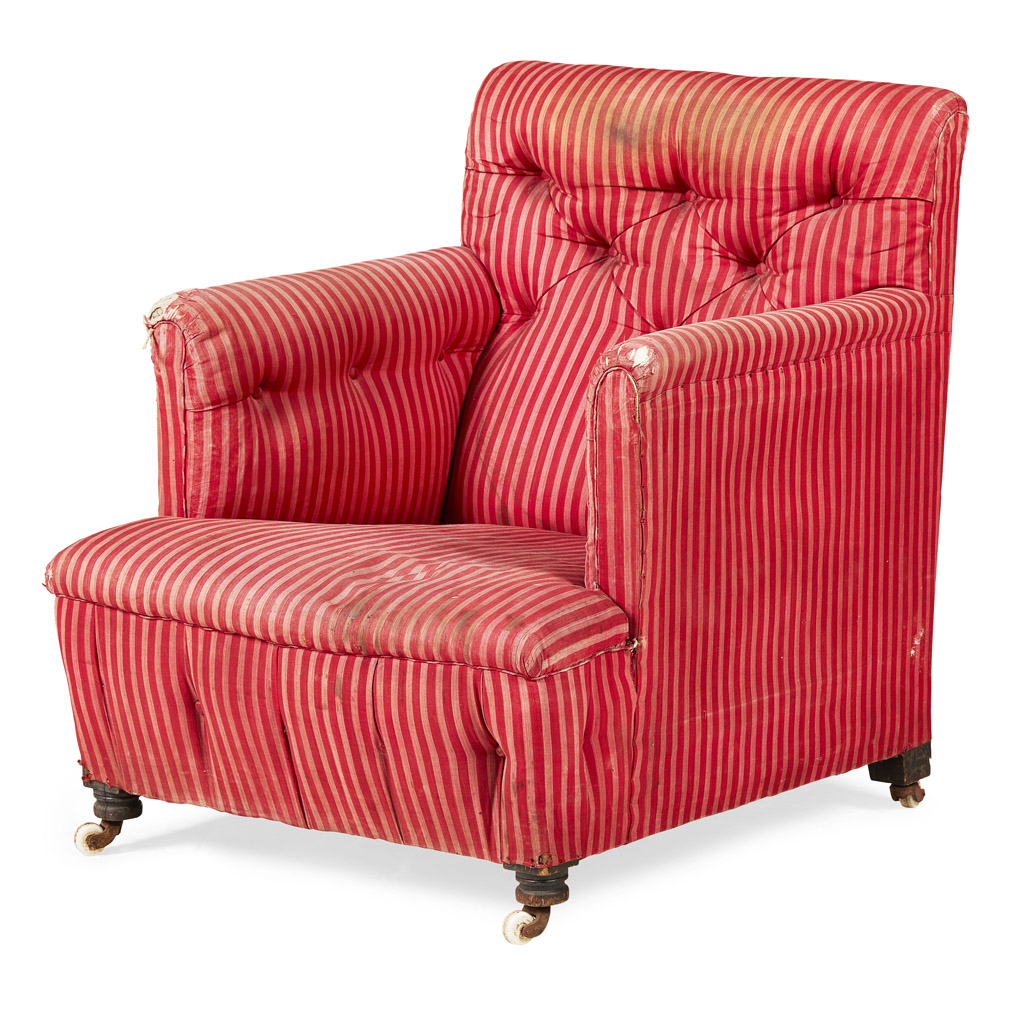 the square button-tufted back and enclosed straight arms above a wide seat, raised on short turned legs with porcelain castors, in red striped upholstery
