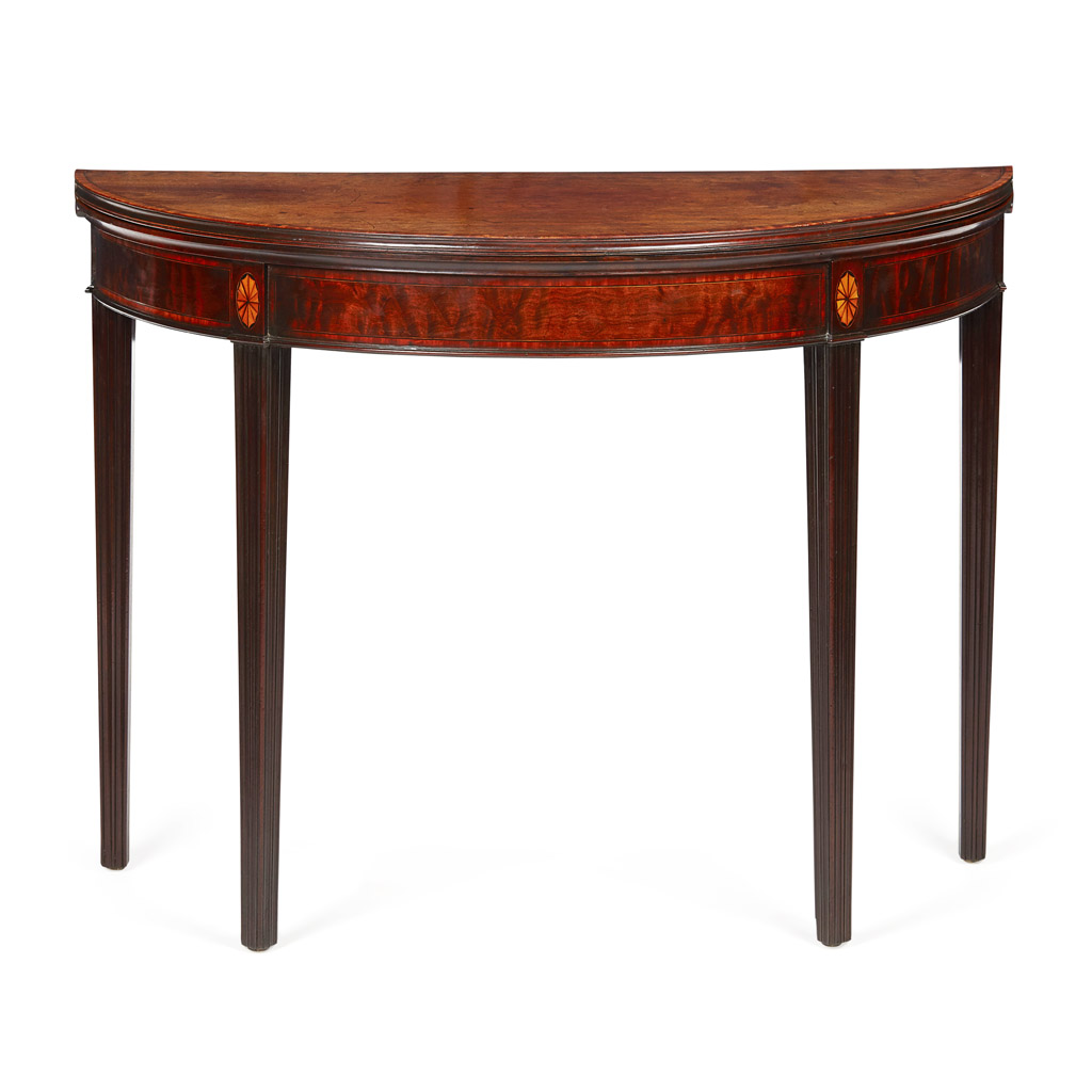 LATE GEORGE III MAHOGANY DEMILUNE FOLDOVER CARD TABLE